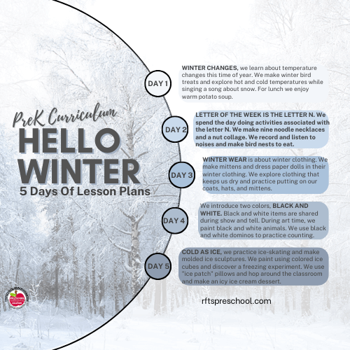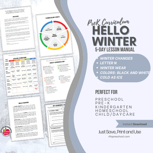 This done-for-you winter curriculum introduces young learners to winter changes, winter clothing, weather, colors, and the letter of the week while building early academic skills through play-based learning, group activities, and simple experiments.