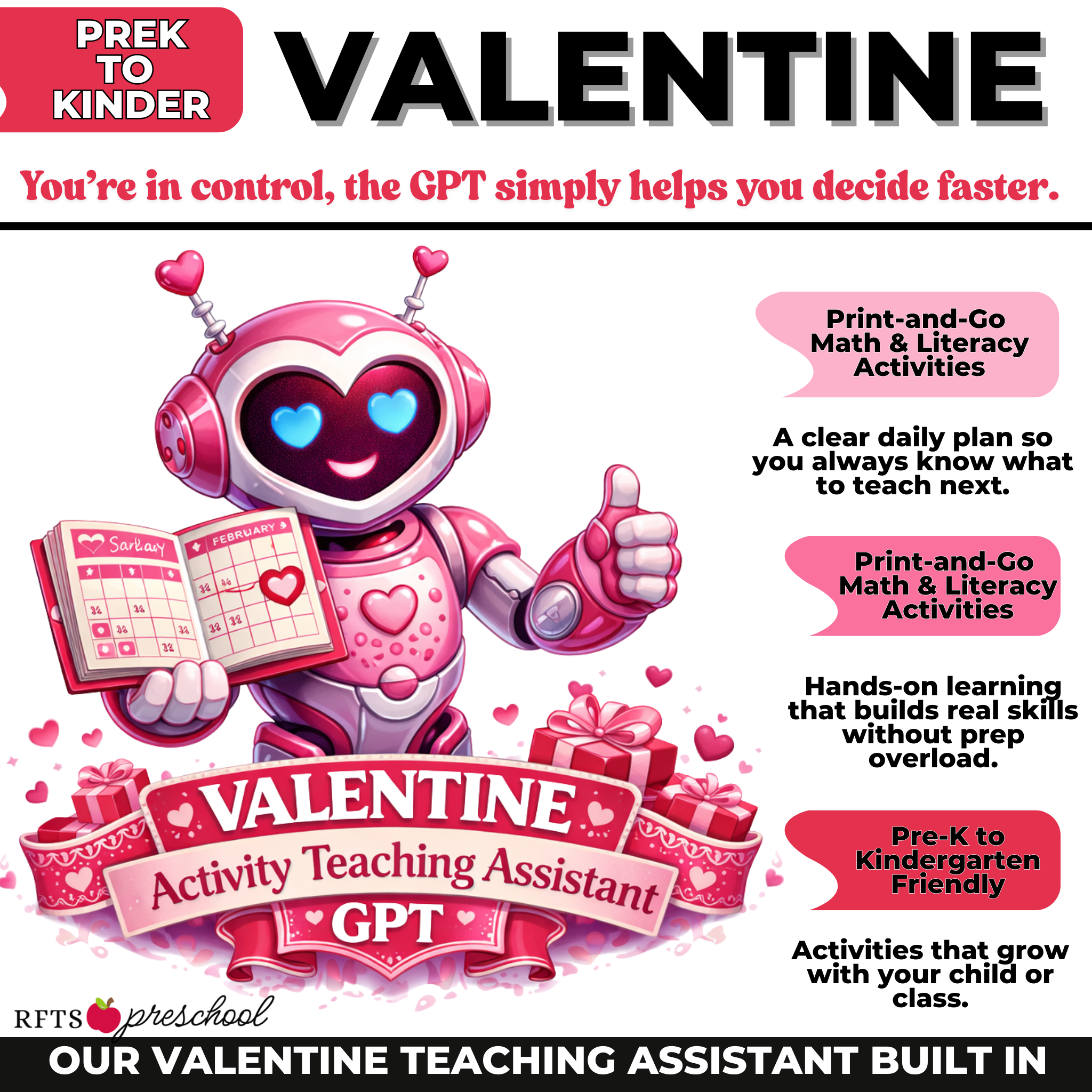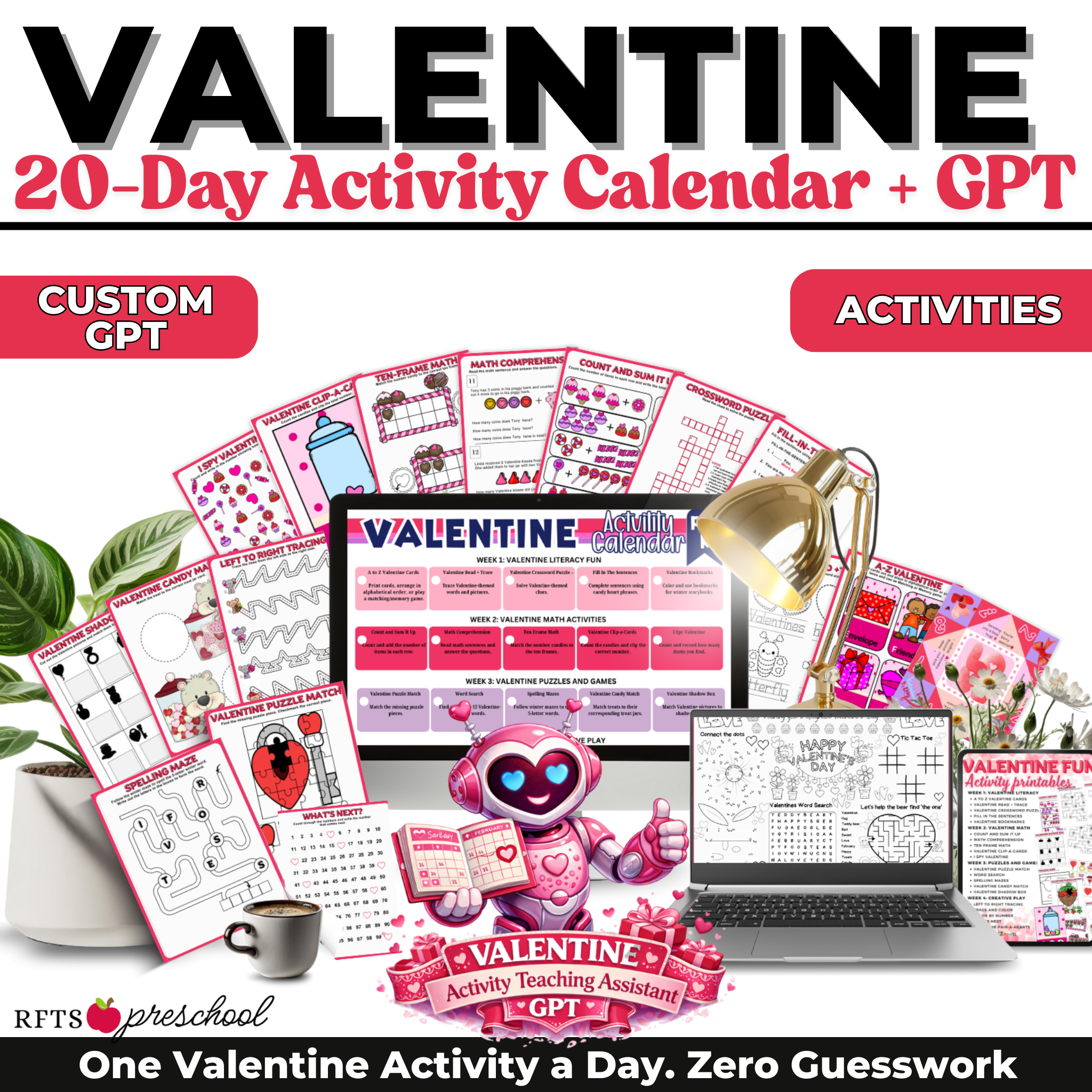 A Fun, Done-For-You Valentine Calendar Complete System GPT for Pre-K to Kindergarten. Celebrate Valentine’s season with 20 days of intentional, skill-building activities—plus built-in guidance when you need it.